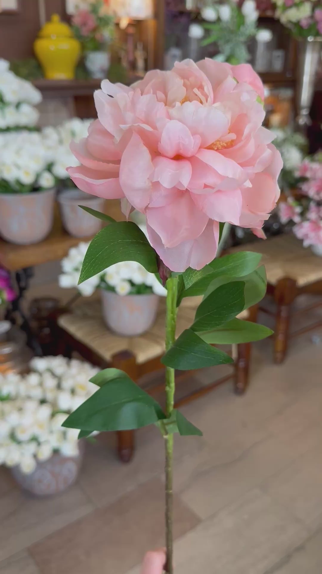 Single stem of blush pink peony blossom, bud, and leaf accents.